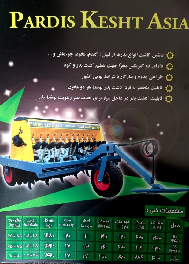 این ماشین بنا به سفارش مشتری در 11 و13 ردیف قابلیت کاشت محصول را دارا میباشد.دارای دو مخزن جهت ذخیر بذر وکود وهمچنین دارای دو گیربکس مجزا میباشد که با کالیبره کردن کردن مقدار ریزش بذر و کود میتوانیم به صورت دقیق میزان بذر در هکتار را تنظیم کنیم. توان كشت انواع بذر از قبيل گندم ، جو ، نخود، لوبیا، يونجه ، شبدر، عدس ، آفتابگردان ، و…